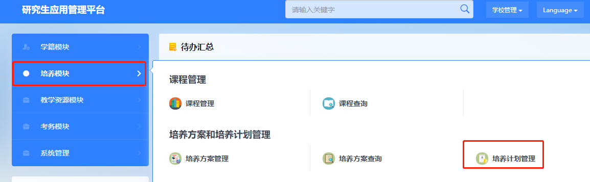 2.进入系统后,选择“培养->培养计划管理”: